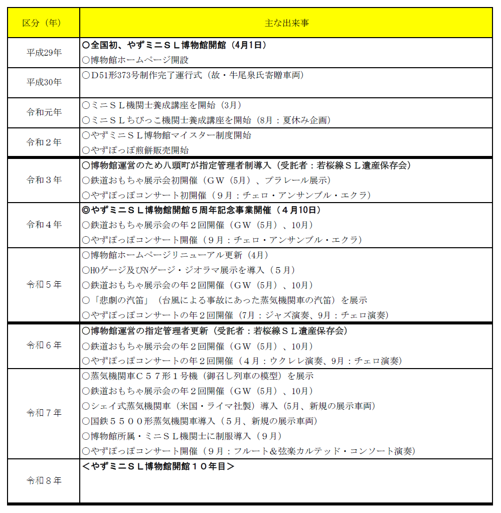 また、開館以来、ミニSL機関士養成講座やちびっ子機関士養成講座の開講、やずミニSL博物館マイスター制度の創設、やずぽっぽコンサートの開催などと様々な活動に取り組んでいます。